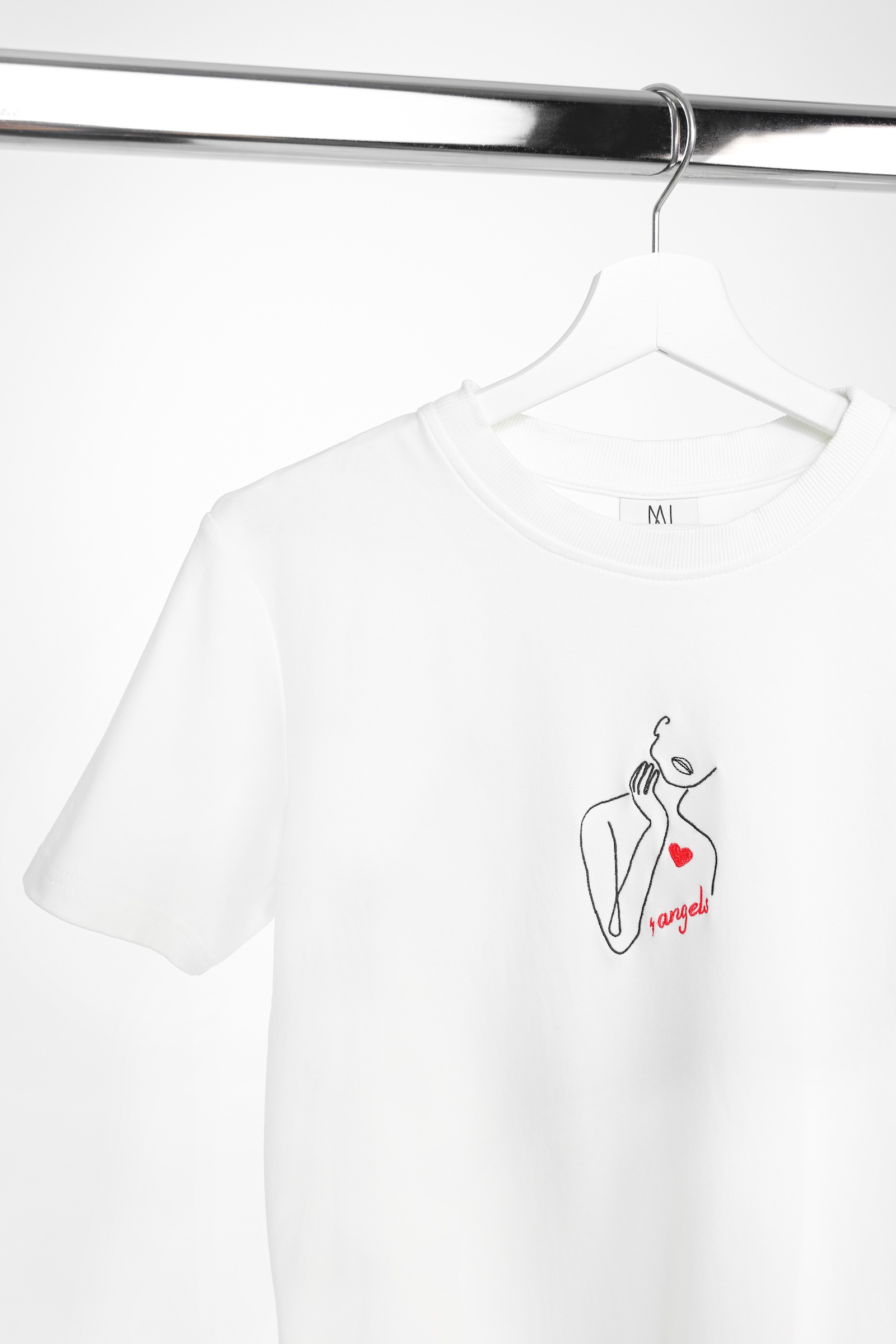 W tylnej części koszulki pod kołnierzem znajduje się dyskretny haft z logo 4angels w kolorze tkaniny. Ten subtelny detal dodaje koszulce elegancji i podkreśla jej luksusowy charakter.