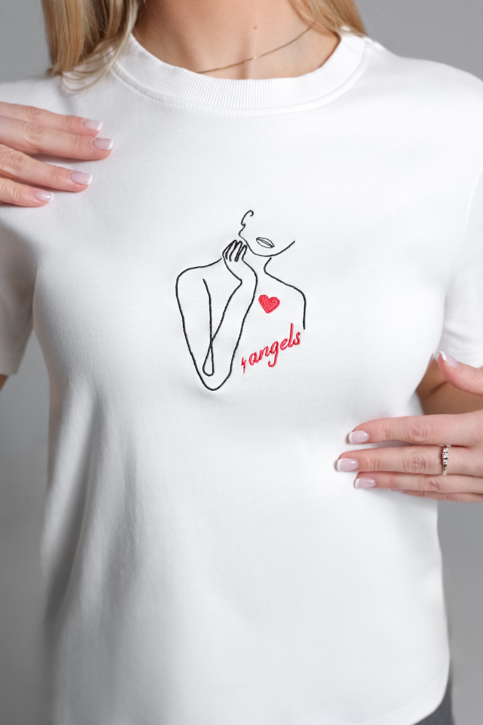 Odkryj nowy wymiar luksusu z białą Koszulką Forever Favorite Tee od 4angels w wyjątkowej odsłonie – z artystycznym haftem „kobieta line art i serce”. Ta koszulka została zaprojektowana, by być ulubionym elementem Twojej garderoby, a nietuzinkowy haft przypomina, że to właśnie serce jest najważniejszym źródłem miłości i pasji w życiu.